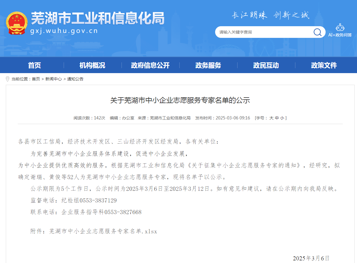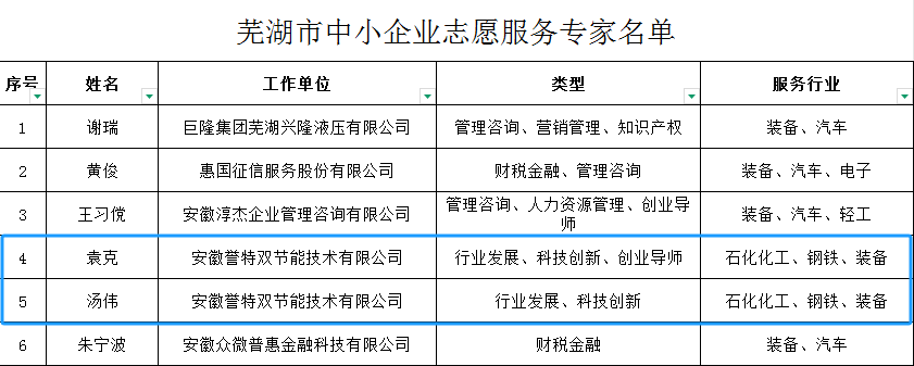 2025年3月6日,為完善蕪湖市中小企業(yè)服務體系建設,促進中小企業(yè)發(fā)展,為中小企業(yè)提供優(yōu)質高效的服務,由市工信局牽頭在全市范圍內開展志愿專家征集評選工作,并最終確定52名各行業(yè)人員組成志愿專家團,我公司總經理袁克、節(jié)能事業(yè)部長湯偉兩位同志入選,在此表示熱烈祝賀。