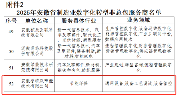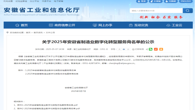 根據《安徽省工業和信息化廳關于公開征集2025年度制造業數字化轉型服務商的通知》,經各服務商提交申報材料、專家評審等程序,省工信廳最終確定發布203家服務商,我公司名列榜單,在此表示熱烈祝賀!